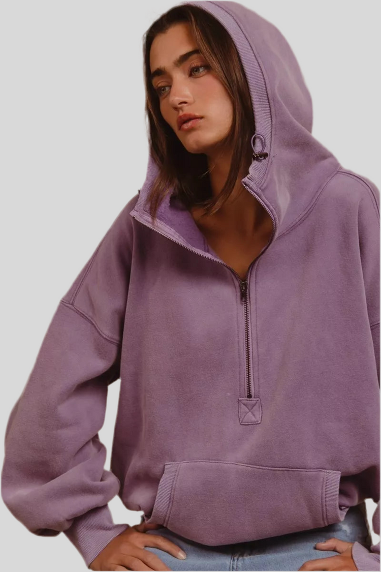 This Suzi Boho half-zip fleece hoodie is designed with stitch details for added texture and interest, while the elastic hem ensures a comfortable and secure fit. Perfect for layering over your favorite tops to stay cozy and stylish. Elevate your casual look with this trendy and practical hoodie.