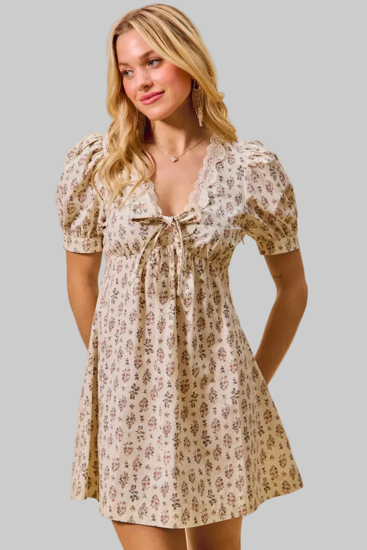 Effortlessly transition from day to night in this Celeste boho-inspired mini dress, featuring a flattering V-neckline and delicate floral print. The lace-trimmed short sleeves and airy silhouette deliver timeless femininity with modern versatility. Layer it with a denim jacket for casual outings or pair with heels for elevated evenings. The mini length offers freedom of movement while maintaining an elegant aesthetic. A wardrobe essential that balances romantic details with practical wearability for any season.